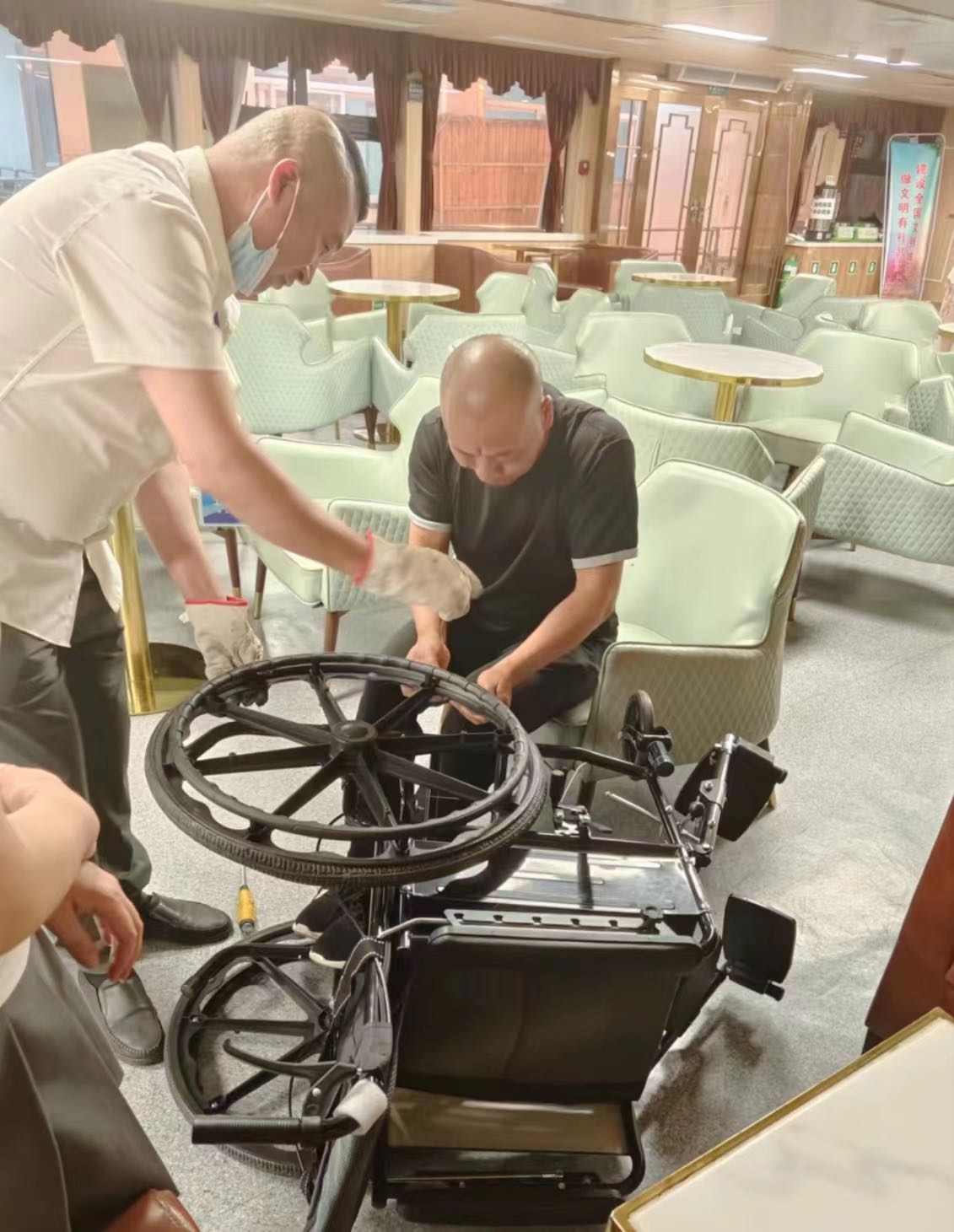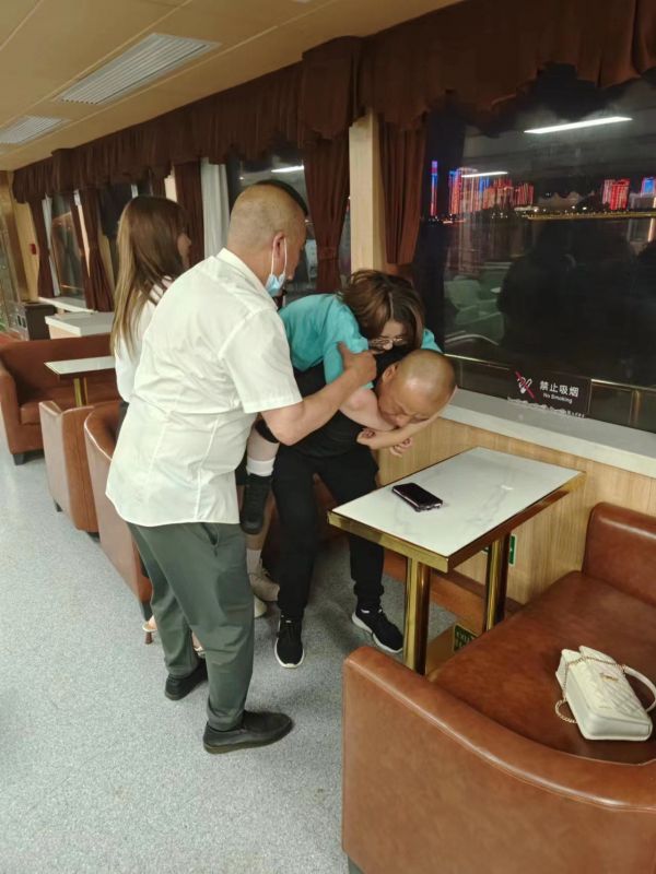 在抬送途中,轮椅不堪重力导致外轮胎脱落,水手长周正军和调度余立斌立即主动帮忙维修,坐在一旁的游客因苗家码头工作人员这一连串的举动感动不已。在交谈中大家知道这位轮椅游客是从新疆赶到武汉同济医院治病,因为高位截瘫她很少出远门,但一直渴望能亲眼看看万里长江。说到这,她很忐忑地问道:“能不能帮我到室外近距离看一眼,我的两个朋友实在是背不动我,就一会儿行吗?”周正军和余立斌听了二话没说,放下手中工具一个背一个托,两人合力将游客背到了游船二楼船尾,并为她设置一个“VIP专座”,由余立斌全程陪同保护游客安全,而周正军则回到一楼继续修理轮椅。