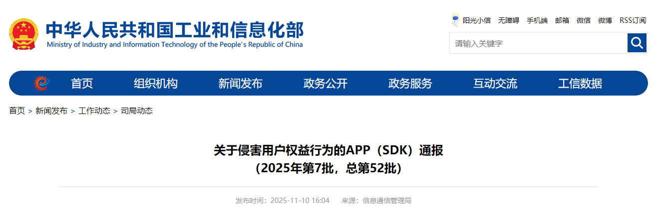 根据中央网信办、工业和信息化部、公安部、市场监管总局等四部门联合发布的《关于开展2025年个人信息保护系列专项行动的公告》,依据《个人信息保护法》《网络安全法》《电信条例》《电信和互联网用户个人信息保护规定》等法律法规,工业和信息化部对App、SDK违法违规收集使用个人信息等问题开展治理。近期,经组织第三方检测机构进行抽查,共发现39款App及SDK存在侵害用户权益行为(详见附件),现予以通报。