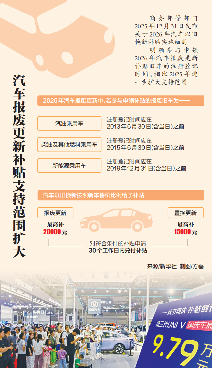 《2026年汽车以旧换新补贴实施细则》明确,参与申领2026年汽车报废更新补贴旧车的注册登记时间,相比2025年进一步扩大支持范围。