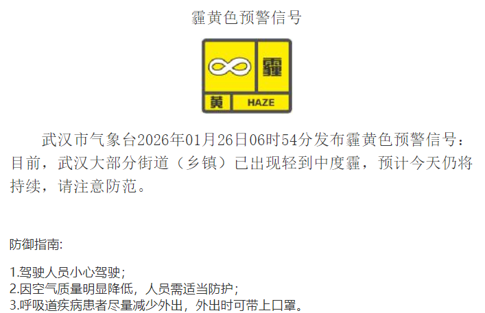 武汉发布霾黄色预警:大部分街道(乡镇)已出现轻到中度霾
