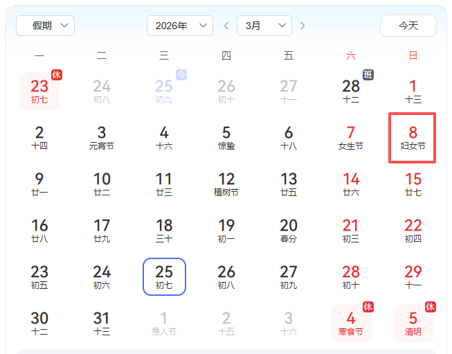 通过日历发现,今年的3月8日在周日。