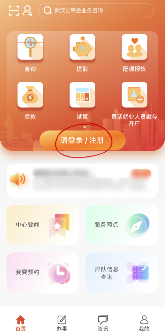 1.打开“武汉住房公积金”APP后,点击“请登录/注册”,点击“忘记密码”;