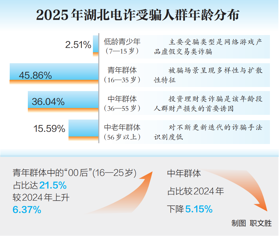 据30日湖北省公安厅召开的新闻发布会上披露,2025年湖北电诈受骗人按不同年龄段占比从高到低排序依次是:青年群体(16至35岁)占比45.86%,中年群体(36至55岁)占比36.04%,中老年群体(56岁及以上)占比15.59%,低龄青少年(7至15岁)占比2.51%。其中,最小受骗者7岁,最大受骗者95岁。