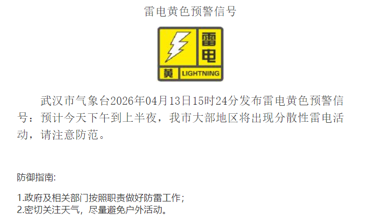 黄色预警!武汉大部地区将出现分散性雷电,请注意防范
