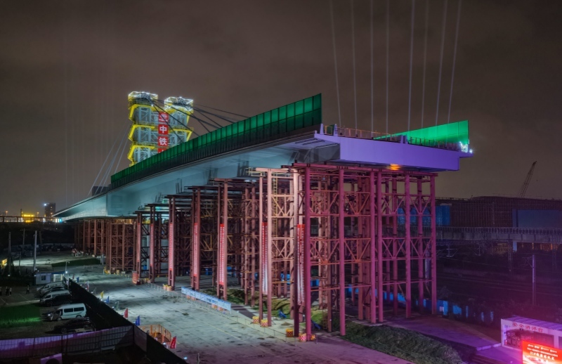 由于桥体重、单侧悬臂长,转体过程中如果稍有误差,都会“失之毫厘谬以千里”。中铁十一局项目经理厉建华介绍:“我们创新采用了‘斜拉扣挂辅助转体技术’,相当于给转体桥装上了一双可靠的‘保险绳’,有效平衡大纵坡带来的桥体重心偏移,在极限空间内完成超高精度动态平衡控制,也为类似复杂工况施工提供了宝贵经验。”