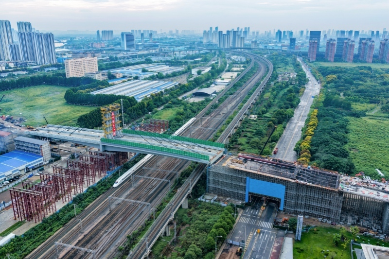 “桥体与铁路仅一步之遥,既要保障安全施工,又不能对铁路正常运行造成干扰,这是考验我们的难题。”湖北交投古一北项目公司总经理占保华告诉记者,此次转体桥施工区域环境极为复杂,桥梁上跨沪蓉、汉丹等8股繁忙铁路干线,日均通行列车超200列。桥体与铁路接触网最近距离仅1.193米,施工区域还邻近高压输电线、弱电、燃气、通信等各种管线,安全风险突出,管控难度极大。
