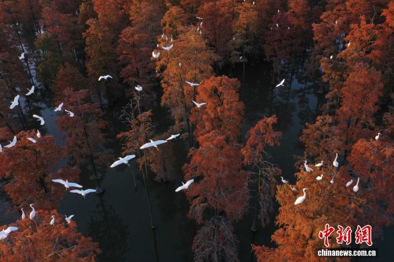 11月26日,湖北武汉,初冬时节,新洲区的涨渡湖水上森林公园迎来最美季节,万余棵池杉树树叶黄红相间,鹭鸟穿梭其间嬉戏觅食,形成“水中有树,树上有鸟,林鸟相依”的生态景观。
