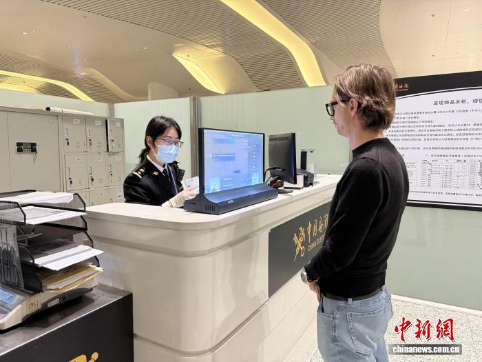 3月31日,武汉天河机场海关工作人员为外籍游客办理通关手续。 (武汉海关供图)