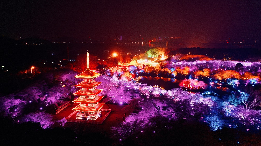 目前,武汉以“相约春天赏樱花”为主线,营造全城赏花、全时赏花的氛围。武汉东湖樱园内栽种有上万株樱花,从3月初至4月上旬“接力”绽放。今年,“夜间赏樱”全新升级,樱花园内共设立有9000多套夜灯、500个灯笼。夜幕降临,唐风建筑群“曲院樱艳”和樱花海相互映衬,带给游客重回盛唐的梦幻体验。