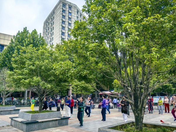 市民在解放公园3号门树阵广场桂花丛中晨练。