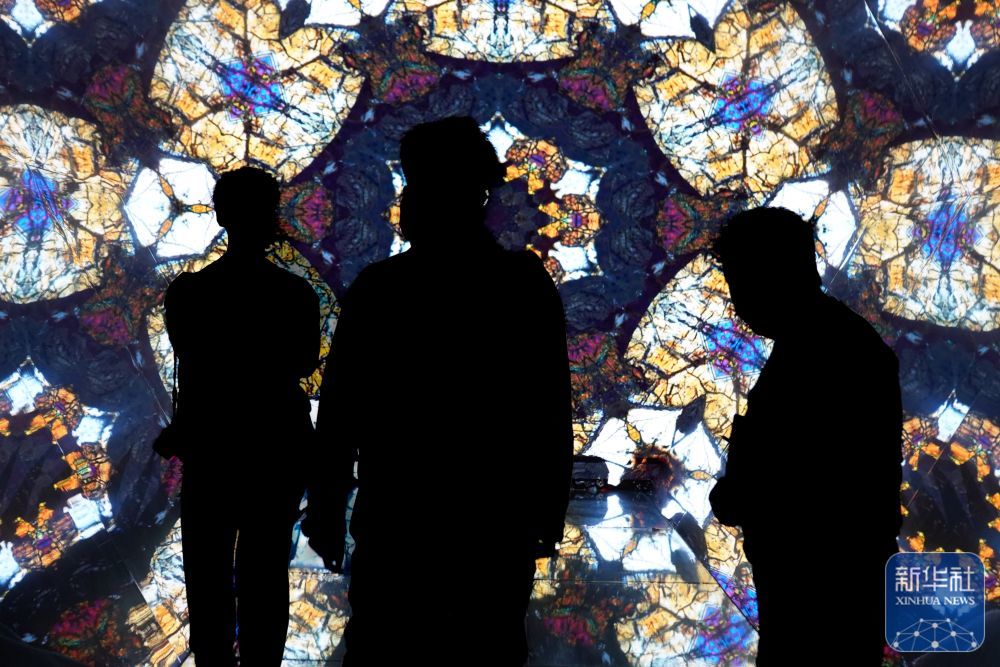 11月6日,一名参观者路过华工科技激光科技馆内由激光技术二次创作的绘画作品