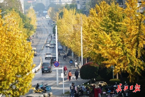 11月24日,武昌首义路至起义门沿线路段上的银杏树枝叶交织,阳光透过稀疏的叶片洒下斑驳陆离的光影,宛如金色长廊,吸引了众多市民来此漫步,拍照留影,享受深秋暖阳。