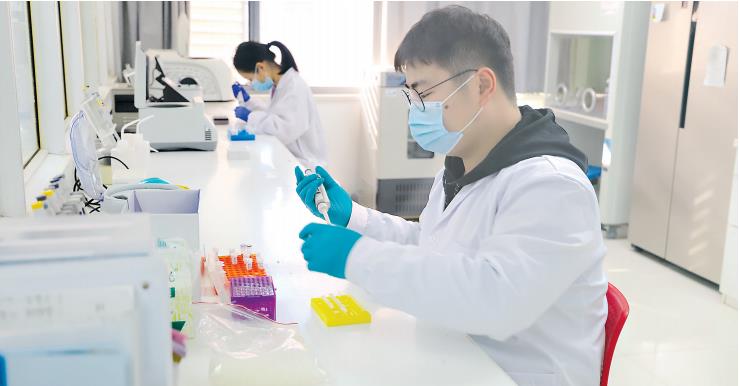 2月14日,2019级水产养殖学博士杨秋实、2019级硕士张策、 2018级硕士研究生马聘和2019级硕士张荣层4位学生正在实验室做实验。他们大部分是第一次留校过年, 对学校寒假期间开放实验室感到满意,认为学校条件设施都很完善的实验室能让留校学生很好完成科研任务。