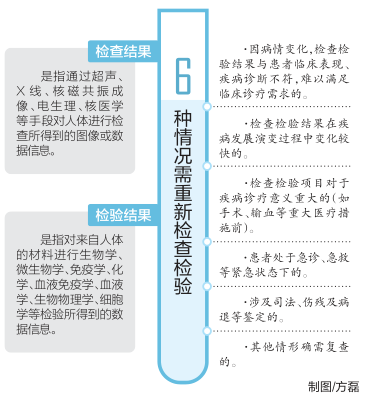 出现以下6种情况,医疗机构及其医务人员可以对相关项目进行重新检查检验:因病情变化,检查检验结果与患者临床表现、疾病诊断不符,难以满足临床诊疗需求的;检查检验结果在疾病发展演变过程中变化较快的;检查检验项目对于疾病诊疗意义重大的(如手术、输血等重大医疗措施前);患者处于急诊、急救等紧急状态下的;涉及司法、伤残及病退等鉴定的;其他情形确需复查的。