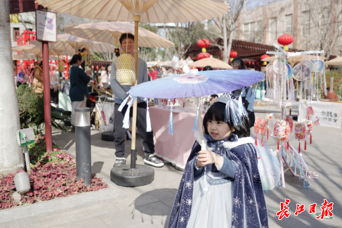 古风市集上,陆续有身着汉服的年轻游客和小朋友在这里慢慢逛,十分惹人注目。8岁的豆豆(小名)身着一袭红色汉服、戴着红色头饰在集市上逛了起来。小姑娘说:“我是从深圳回武汉过年,和奶奶、妈妈和哥哥一起逛昙华林,刚刚我们参与打枪游戏,还获得了两个娃娃”。