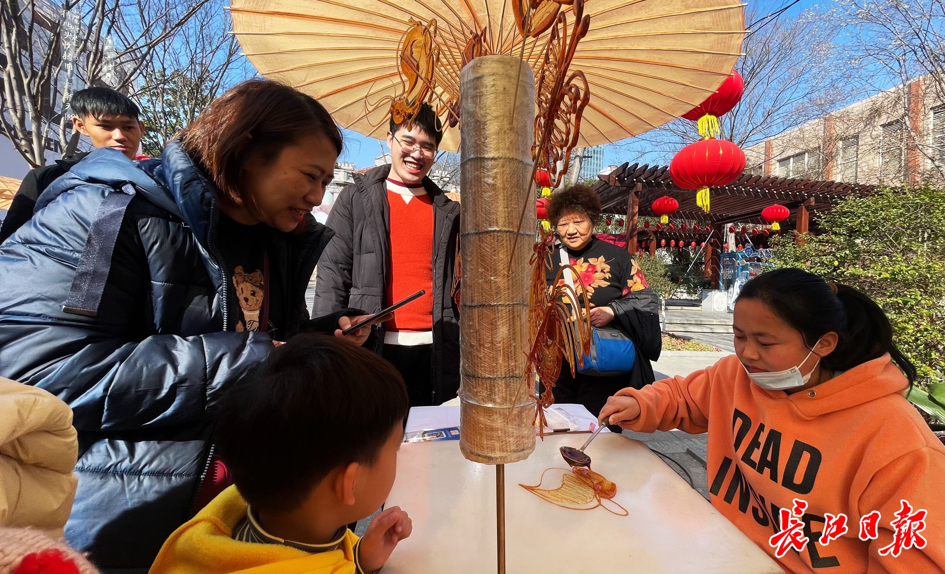 吴女士带着孩子从河南来武汉过年,小朋友在糖画摊前仔细看着画糖人在一块白色板子上一点一点勾勒图形,久久不愿离开,最后自己选了一个燕子造型的图案糖画。吴女士表示,孩子平时喜欢糖画,没想动昙华林也有,感觉武汉很热闹,也很好玩。