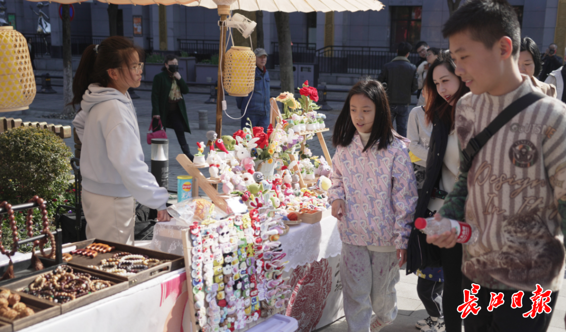 2月12日下午,记者在昙华林东广场看到,多个摊位分成两列展开,每个摊位上支撑起一把木质大伞,在一串串红灯笼的映衬下,增添了不少古韵之气。红色的糖葫芦、图案造型萌萌的棉花糖、做工精巧的钩织饰品等各具特色的摊位都吸引了不少游客围观。
