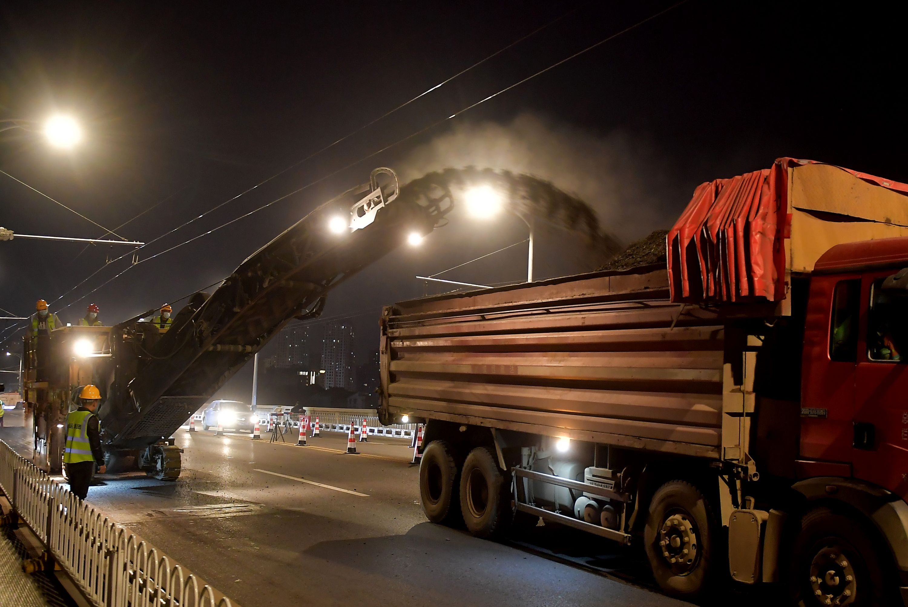 14日晚,武汉长江大桥武昌往汉阳方向打围修路,铣刨车将粉碎剥离的旧沥青渣输送至渣土车。