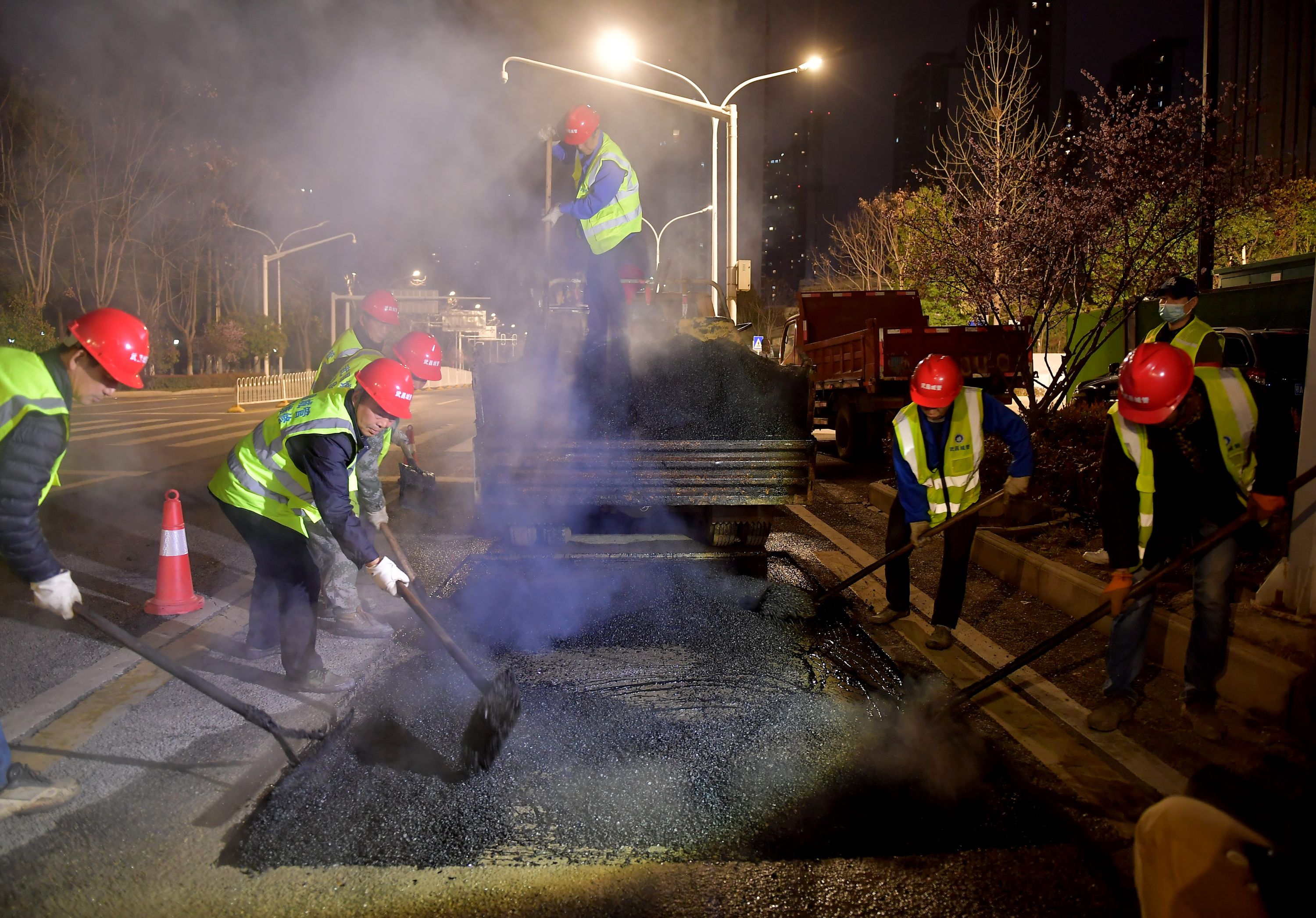 14日晚,武昌公正路打围修路,施工人员摊铺沥青。