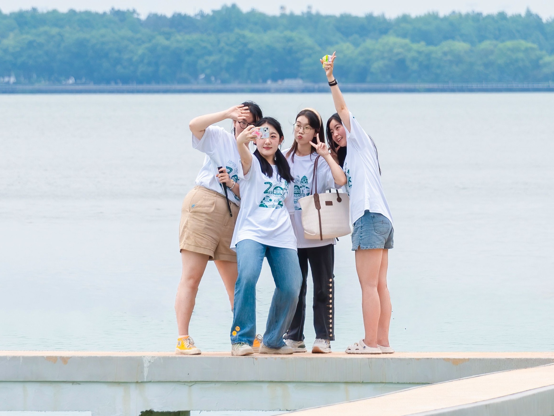 学生们在凌波门栈桥上合影留念。陶进 摄