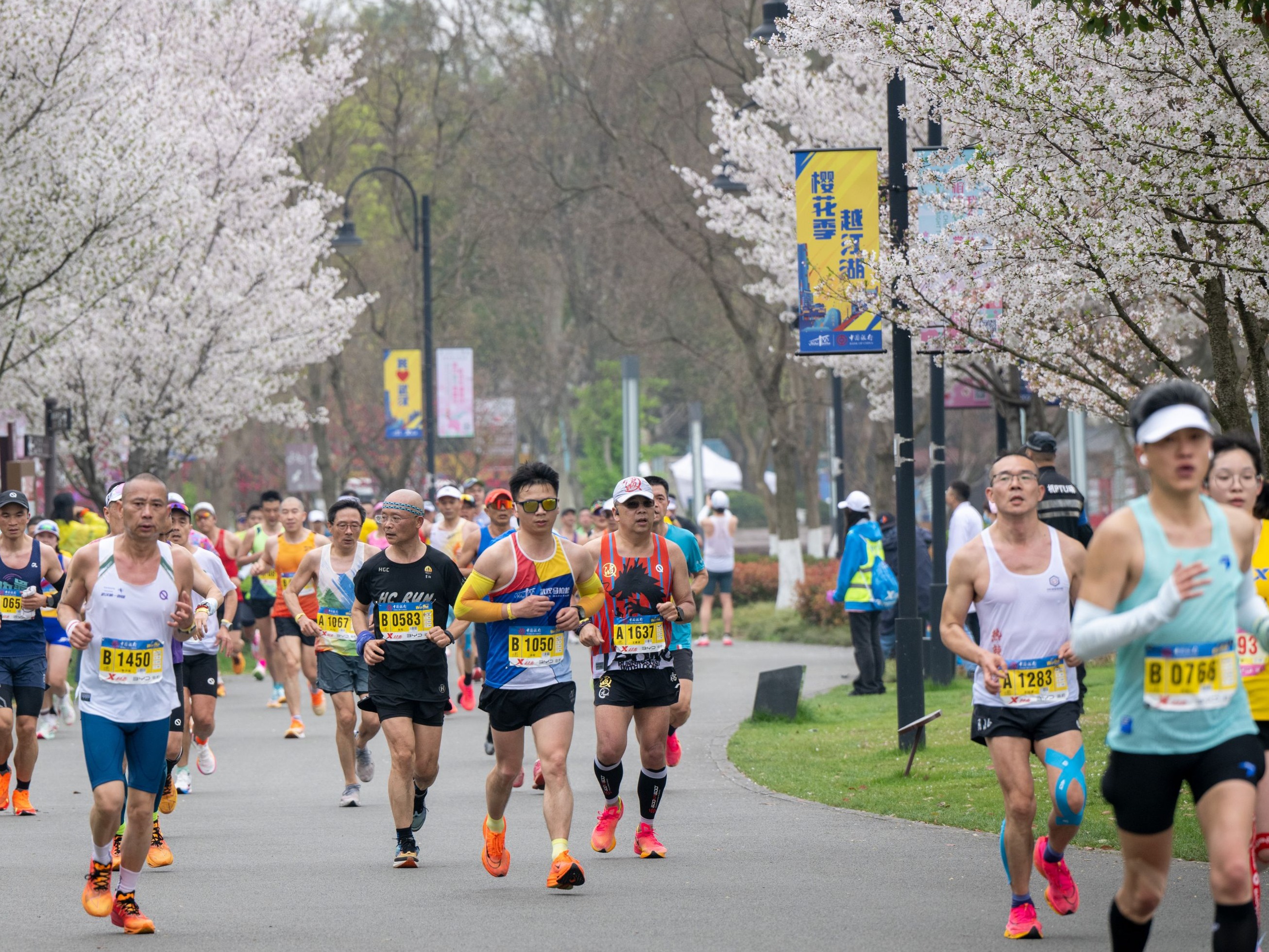 2024武汉马拉松,全球参赛者奔跑在樱花绽放的东湖绿道上。张瑾 摄