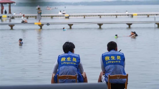 玩水需注意安全,听涛泳场救生员为游客保驾护航。