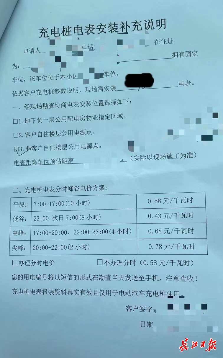 熊女士报装个人充电桩电表时,安装说明中明示了峰谷电价的时段和费用。 记者杨荣峰 摄