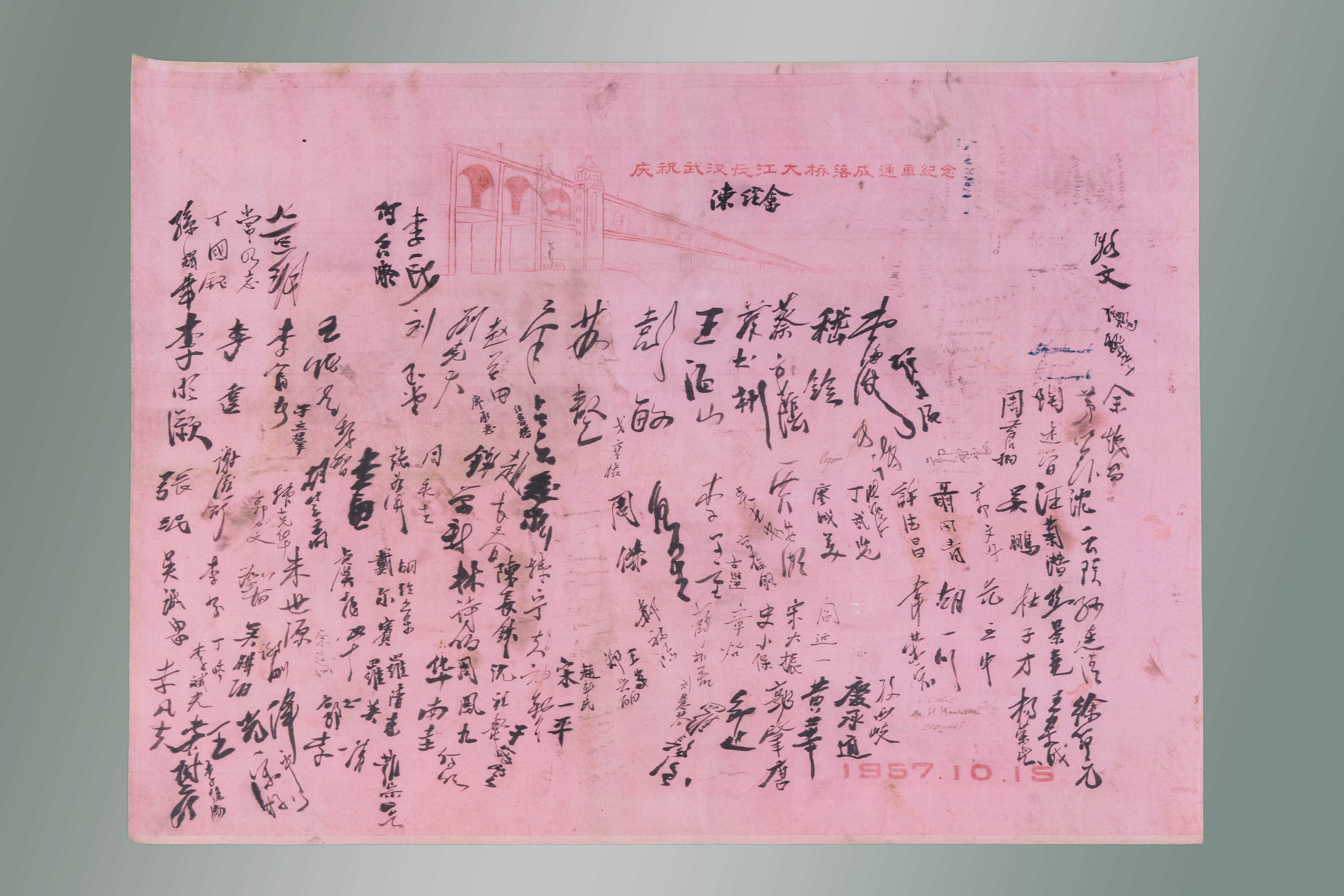 这方签名丝绸呈粉红色,因年代久远已略有褪色,上方印有“武汉长江大桥落成通车纪念”的红色标题。旗面上密密麻麻地布满了参加通车仪式来宾的签名。
