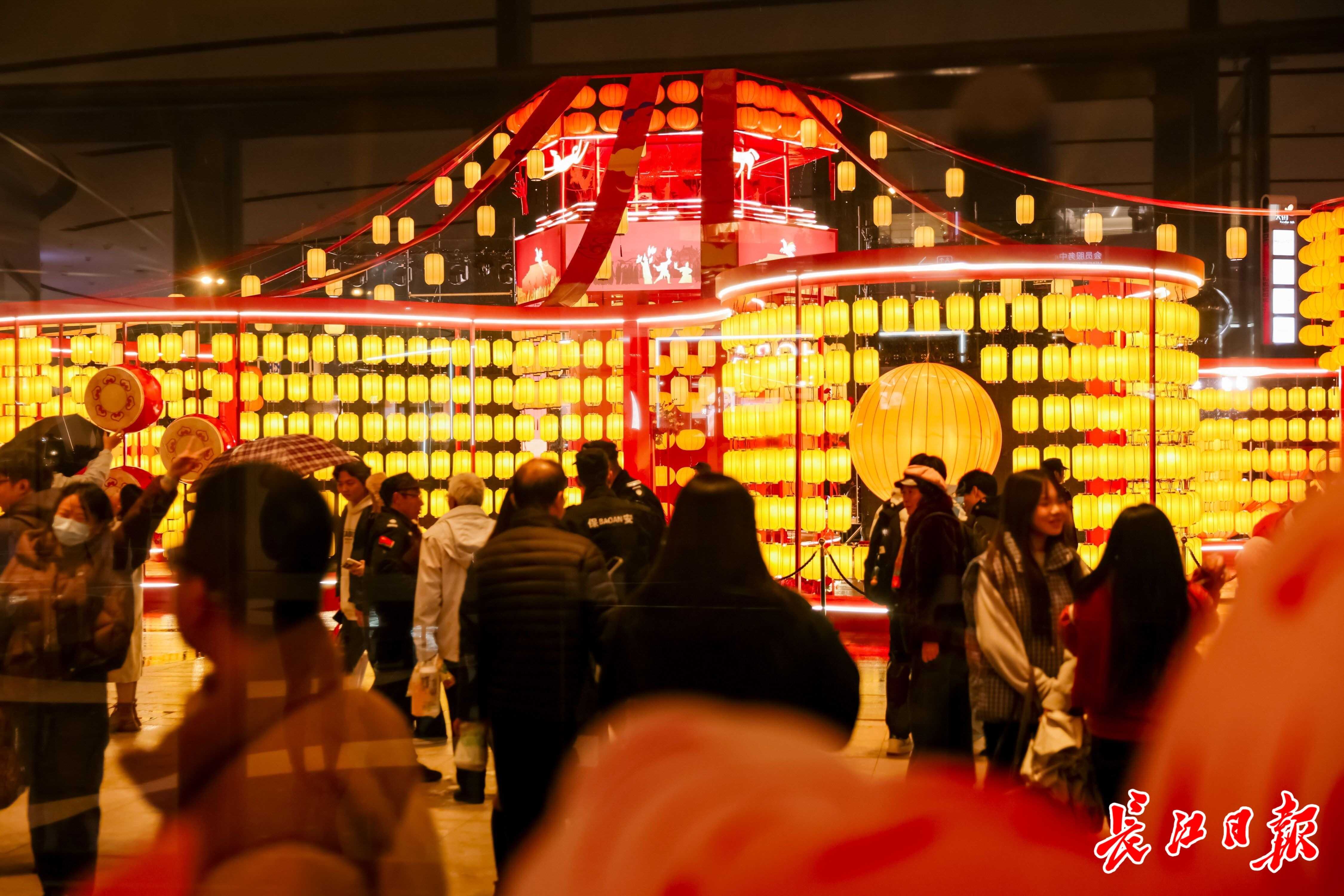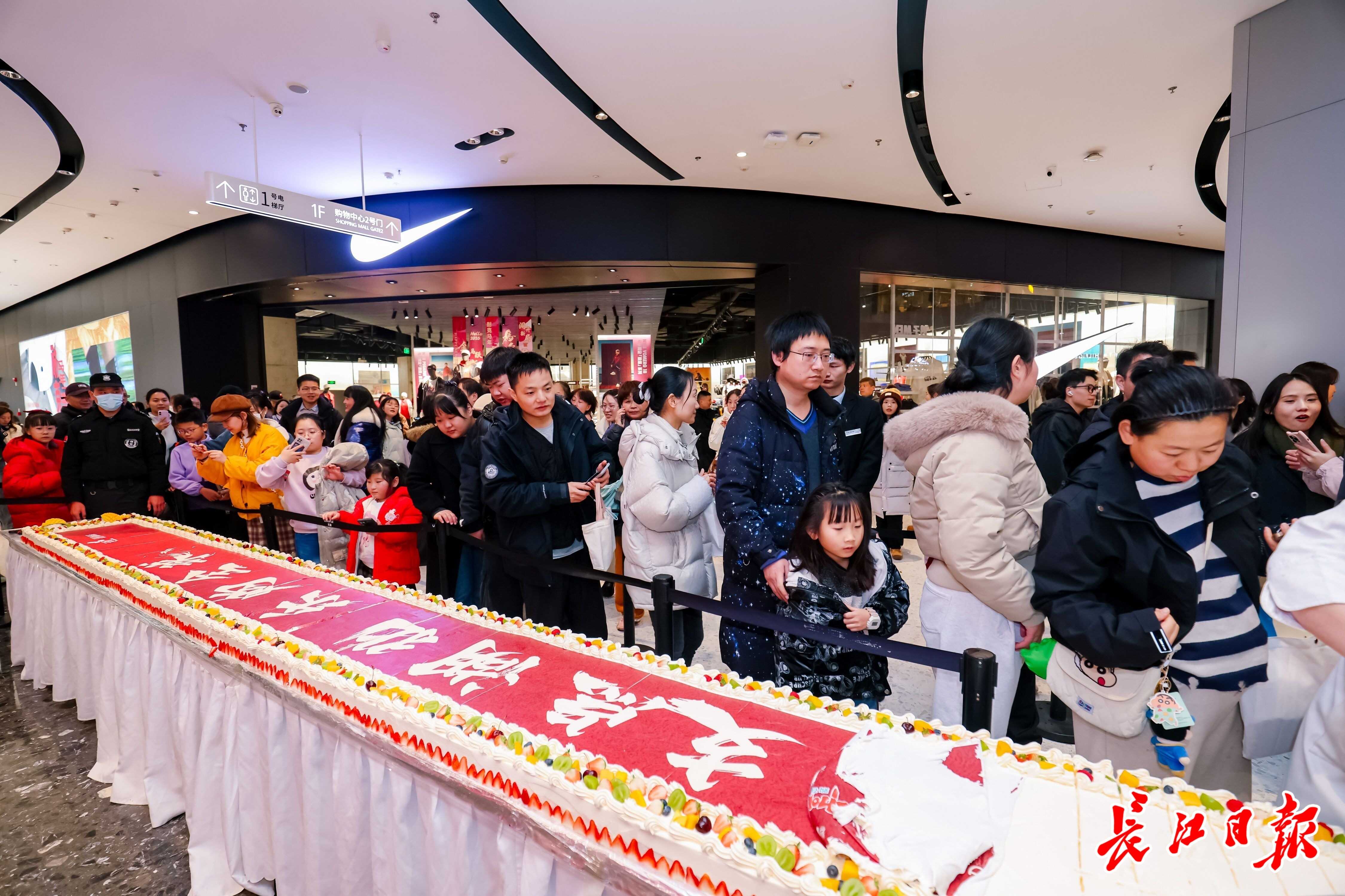 除了逛吃,江宸天街前门广场上,500米巨型灯笼矩阵打造的“光影江湖”吸引了不少市民拍照打卡。一楼大厅巨型蛋糕的免费品尝活动前,不少游客早早排队,一同分享节日的喜悦。