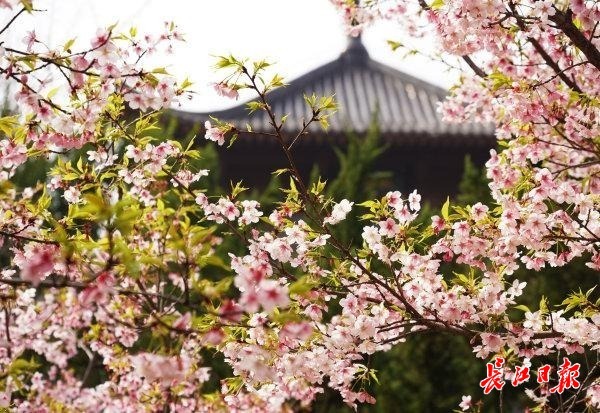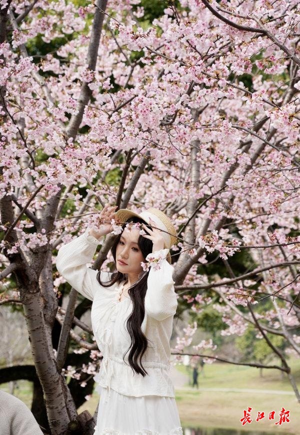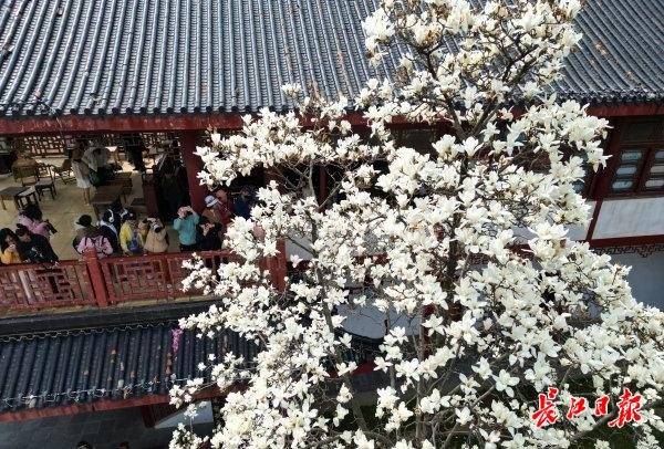 3月7日,不少市民搭乘地铁1号线来到武汉堤角公园赏春花,目前园区里白玉兰、早樱和高盆樱桃同时开花。特别是唱晚亭旁的一株高大白玉兰树,白色的花朵与周边的仿古建筑同框格外上镜,吸引了众多市民和游客争相拍照留影。