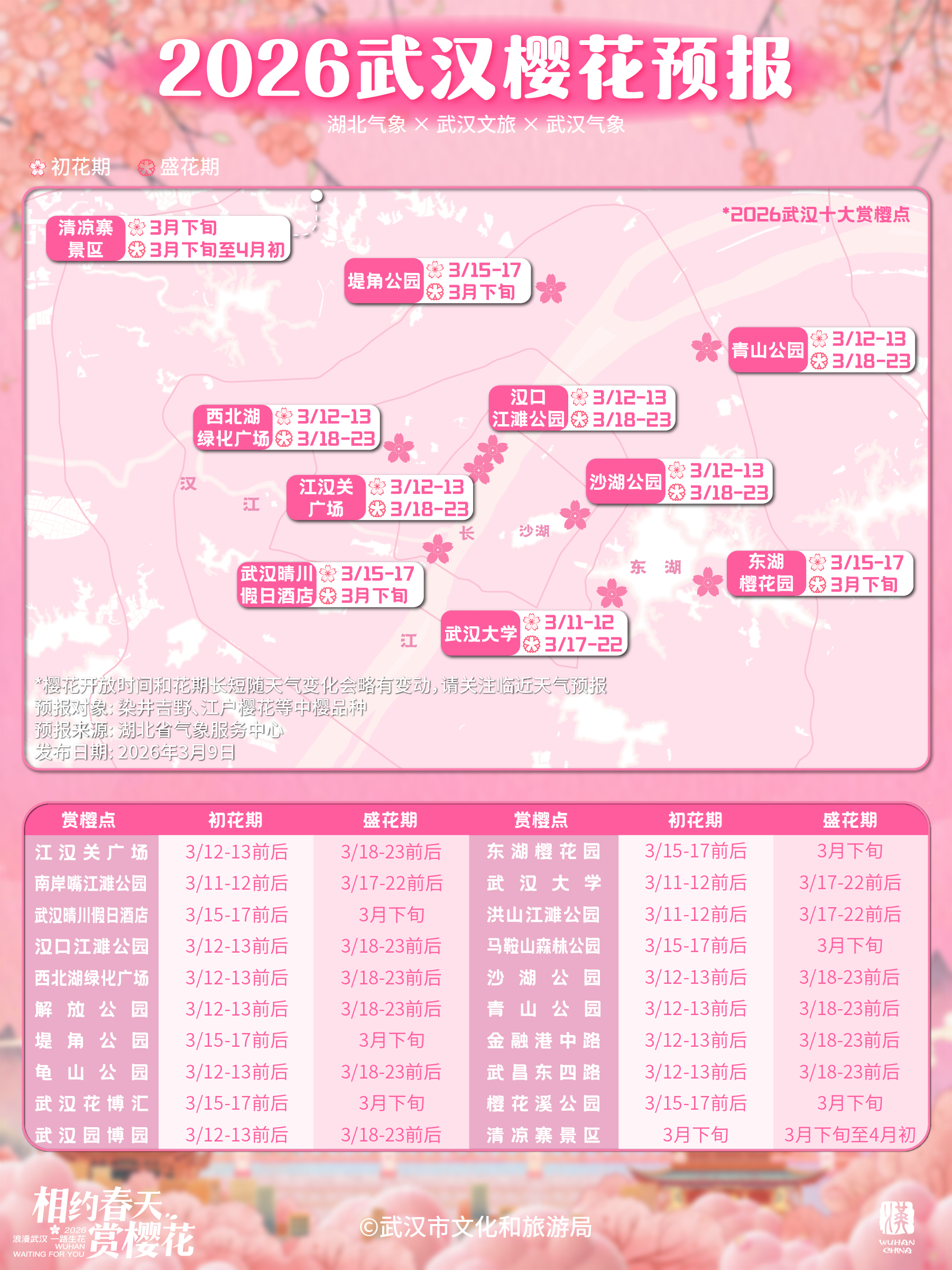 作为全国闻名的赏樱胜地,武汉何时花开最盛?去哪里能邂逅最佳景致?这已成为春季旅游市场备受关注的话题。3月9日,武汉市文化和旅游局联合湖北省气象服务中心、武汉市气象局正式发布《2026武汉樱花预报》,这份精确到天、覆盖全市各大热门赏樱点位的权威花期预报,正式宣告武汉进入全城赏樱的“樱花时间”。今年花期预报显示,最具观赏价值的中樱品种将在3月17日左右迎来盛花期。