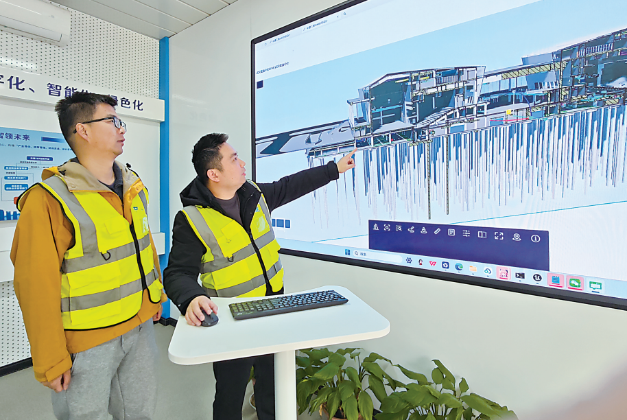 在项目部“智造中心”,工作人员将建筑模型投射在大屏上,仔细察看。