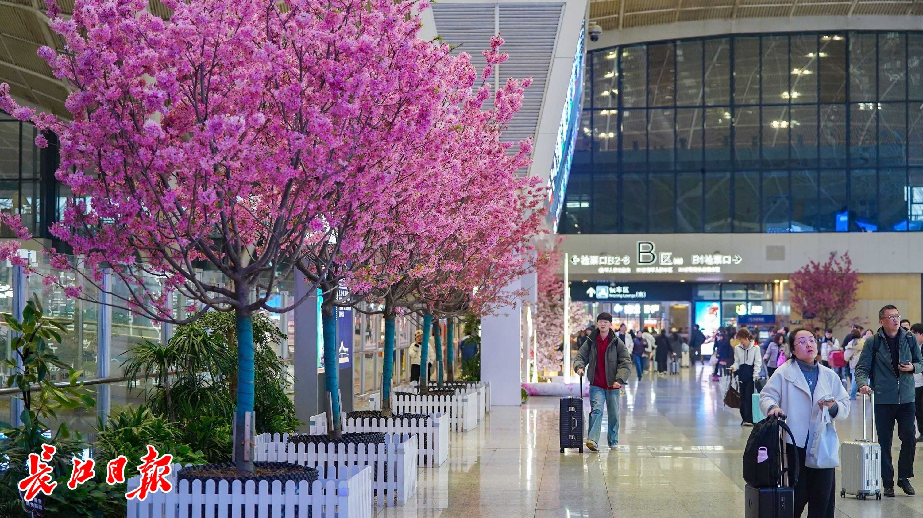 同样感到新奇的,还有来汉赏樱返程的外地旅客陈女士一行。在西进站口站厅内,她和两名同伴看到10余株樱花,欣赏了半天。“我还是头一次在火车站内看到樱花。”陈女士说,这道独特的风景,很有创意。