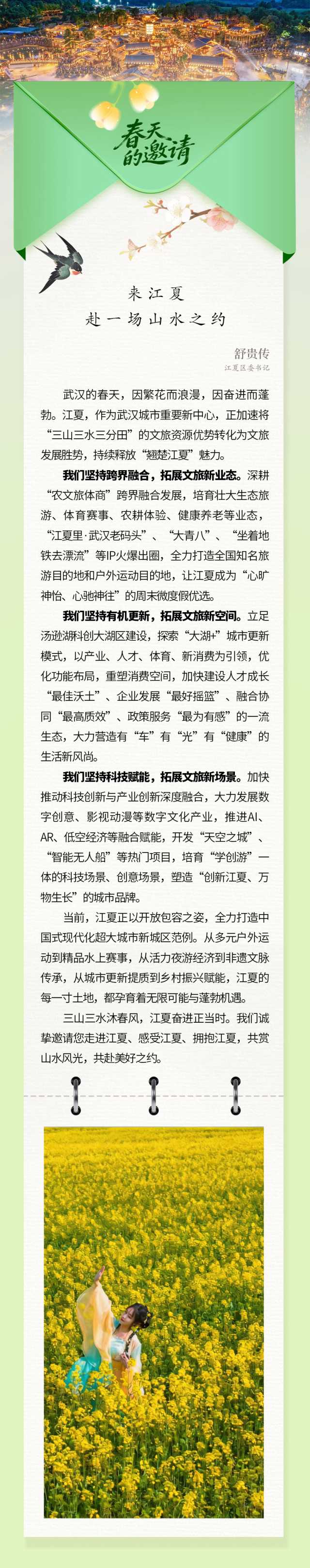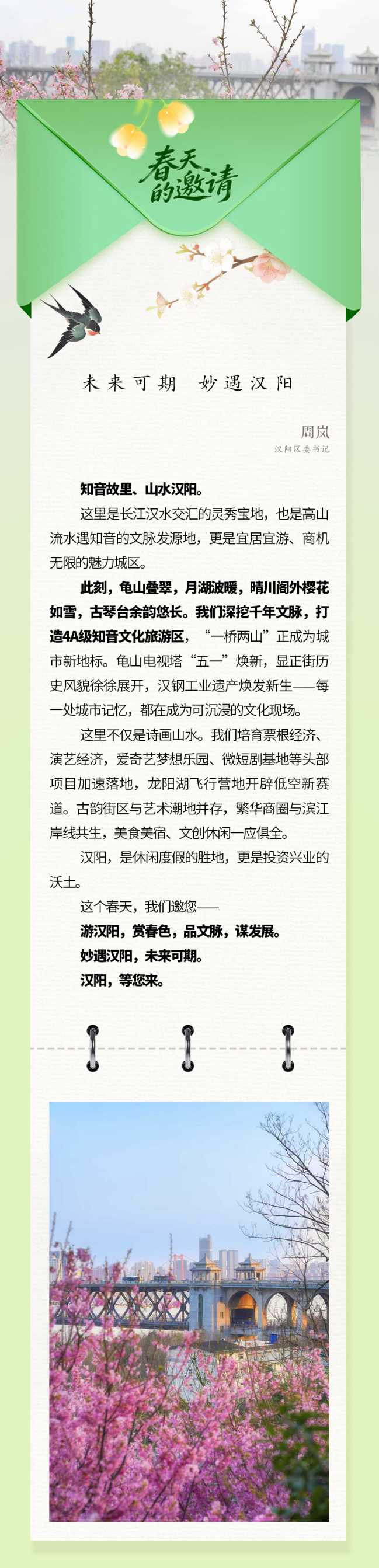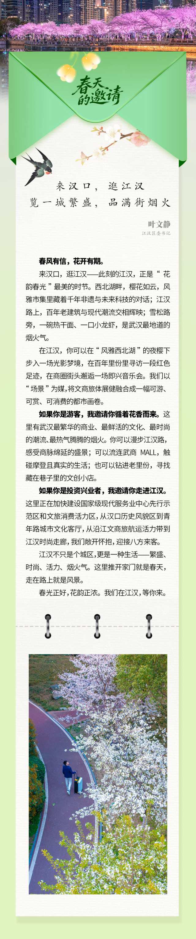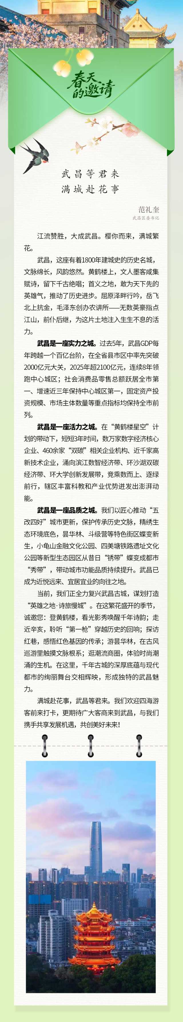今天,第一批来自武汉各区的春天请柬已至—— 请您亲启,共赴江城之约!
