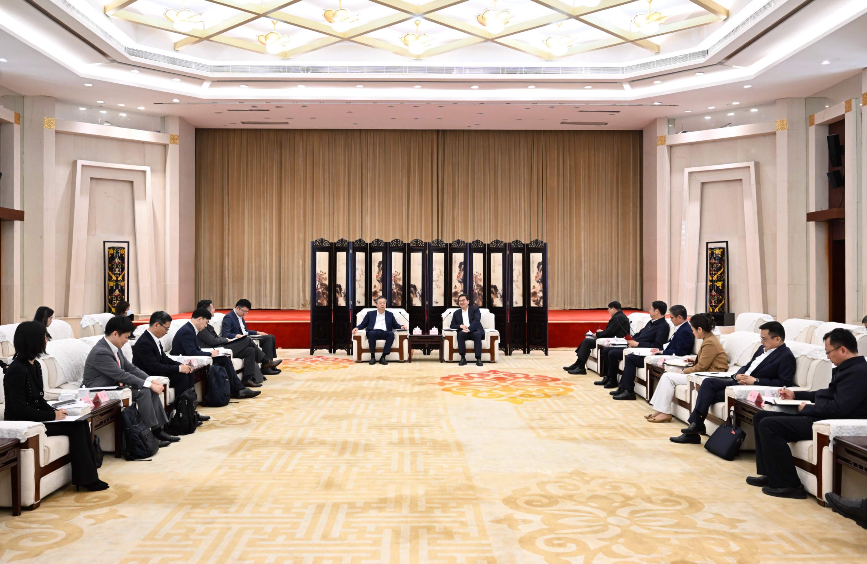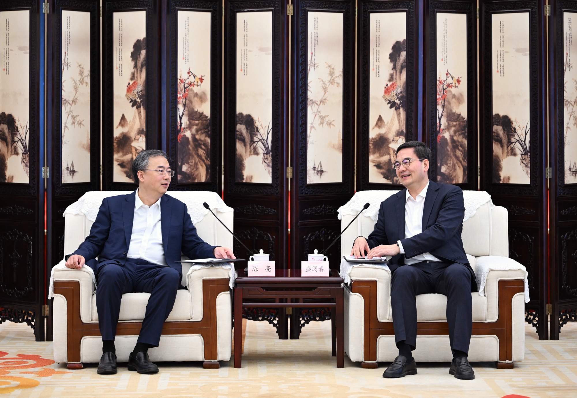 3月31日,省委常委、市委书记盛阅春会见来汉参加2026“相约春天赏樱花”经贸洽谈活动的中国国际金融股份有限公司党委书记、董事长陈亮。