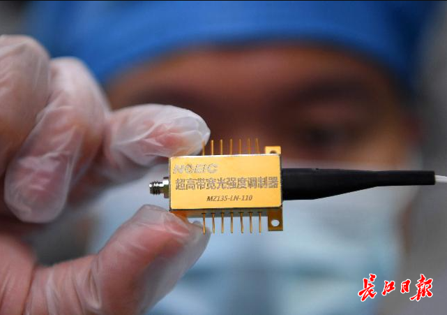 国家信息光电子创新中心,工程师展示国内首款110GHz电光强度调制器,该产品核心芯片和零部件已全部国产化。