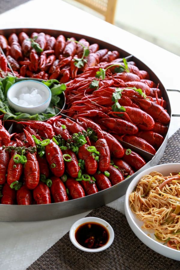 当晚,身着白色服饰的食客们在慧心雅社亲水露台,看船儿悠悠划过,净手焚香,听乐声悠悠。肉质紧实细腻的油焖虾,蒜香扑鼻的蒜蓉虾、爽滑弹牙的清蒸虾……全虾拼盘中,各式各样小龙虾菜品款让人目不暇接,引得食客啧啧称赞,“小龙虾吃法这么多!”