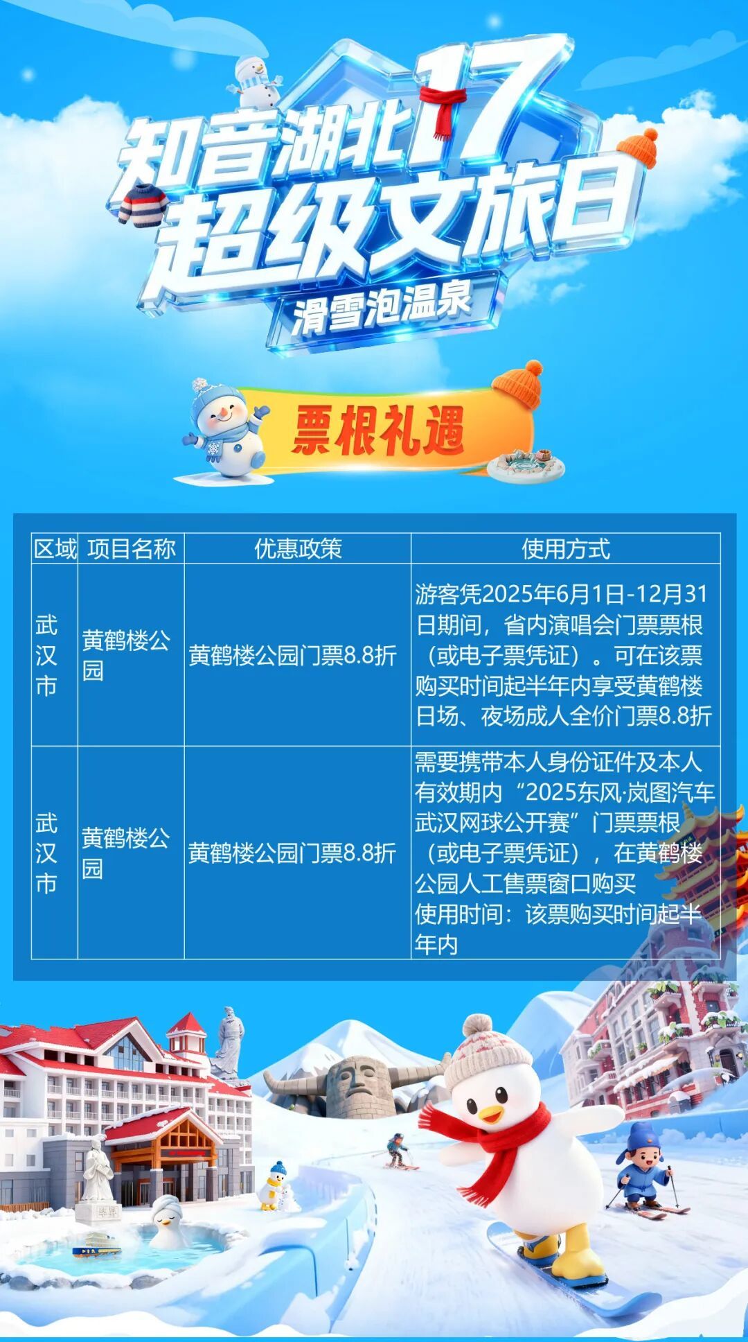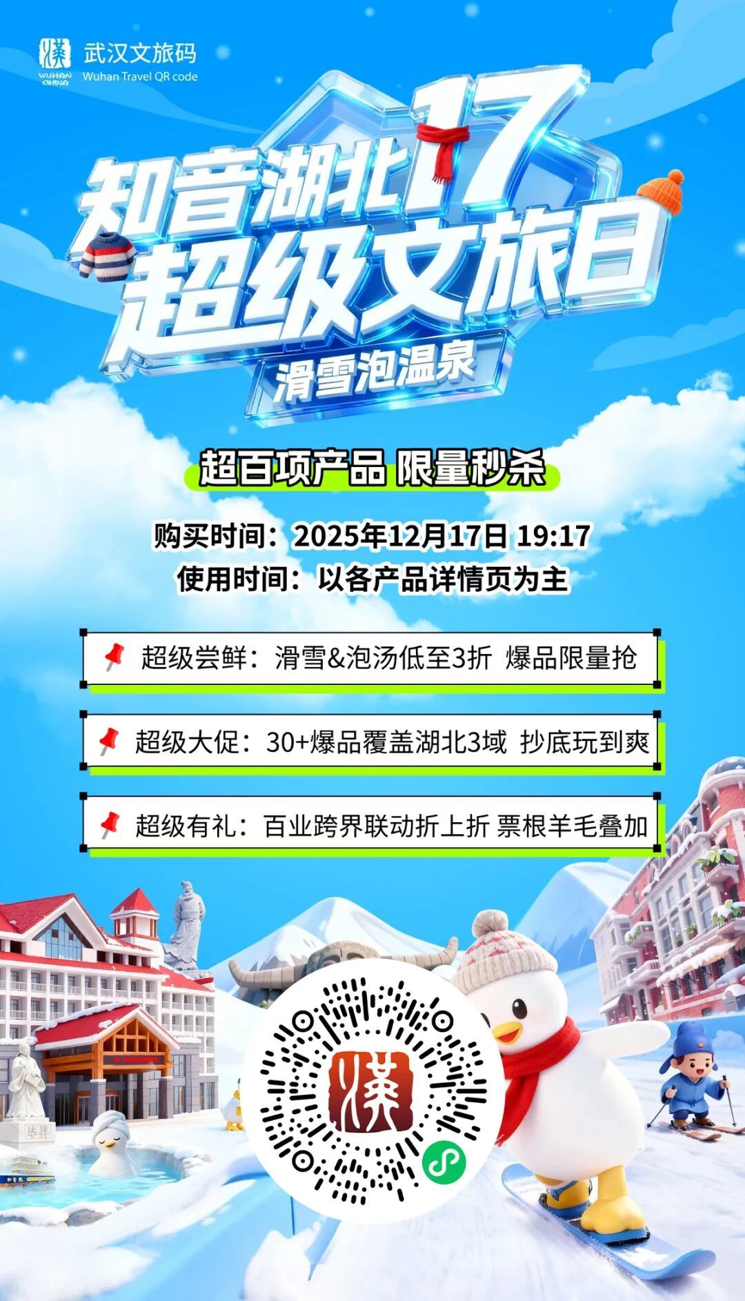 “知音湖北·超级文旅日”17滑雪泡温泉,武汉面向全国游客发起“来武汉一起滑冰雪”的邀约,整合省内滑雪×温泉×景区×酒店×演艺资源,既是冬季上新,又是年末大促,超!级!爆!