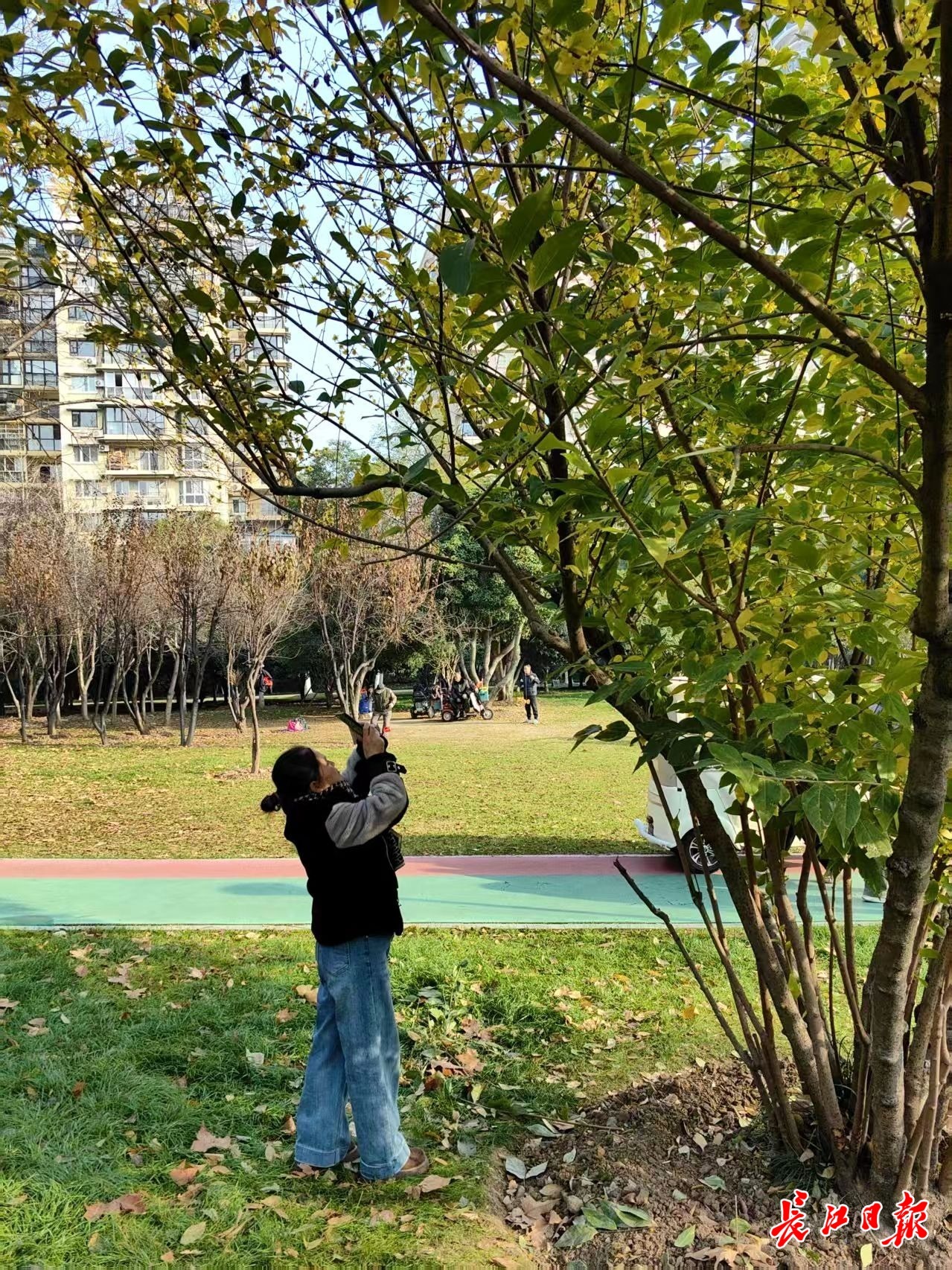 市民潘女士手举相机,对着一株蜡梅连拍多张照片。她说:“今天休息来逛公园,没想到蜡梅开花了,真是惊喜。”