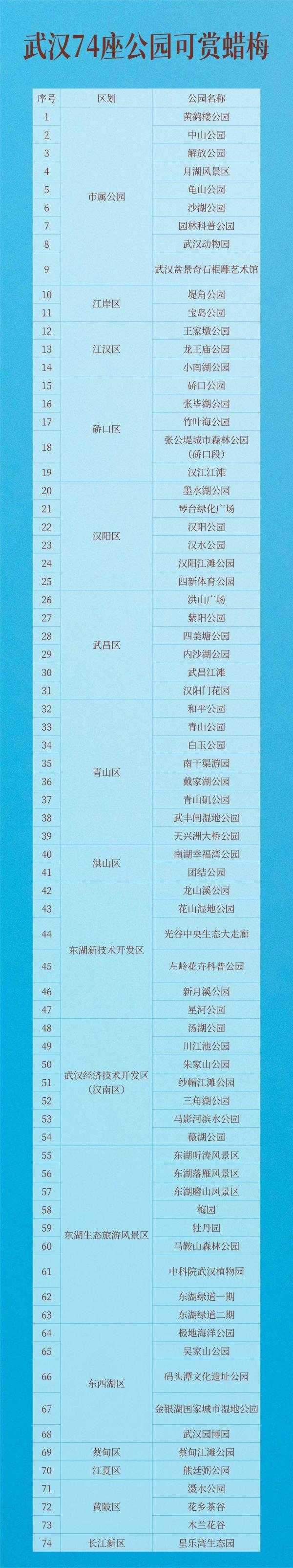市园林和林业局统计数据显示,目前武汉有74座城市公园种有蜡梅,总量5400余株,涉及120余个品种,约占全国品种总数的六成。常见蜡梅品种有素心梅、狗牙梅、虎蹄梅、磬口梅、金钟梅等。其中,东湖梅园以百余品种、3000余株的规模位居首位。黄鹤楼公园、解放公园、中山公园等20座公园,蜡梅数量均超过50株。