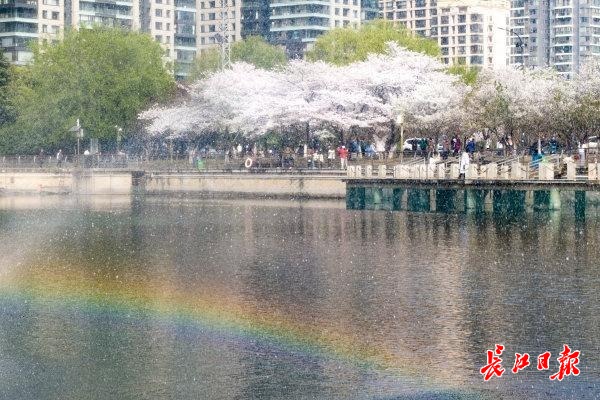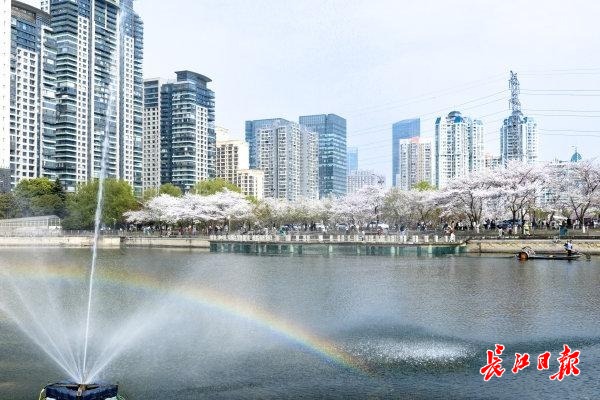 3月28日,西北湖公园的樱花正在盛放,满树繁花如云似雪,在春风里轻轻摇曳。正值周末,为迎接广大市民游客,湖边的喷泉也已开启。水柱凌空而起,水花在阳光下晶莹剔透,恰好映出一道绚丽彩虹,横跨湖面。樱花粉白、湖水清澈、彩虹斑斓,三者同框,构成了春日里最治愈、最浪漫的画面。