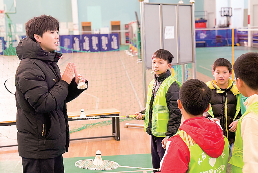 羽毛球世界冠军李茵晖(左一)为孩子们讲解比赛规则