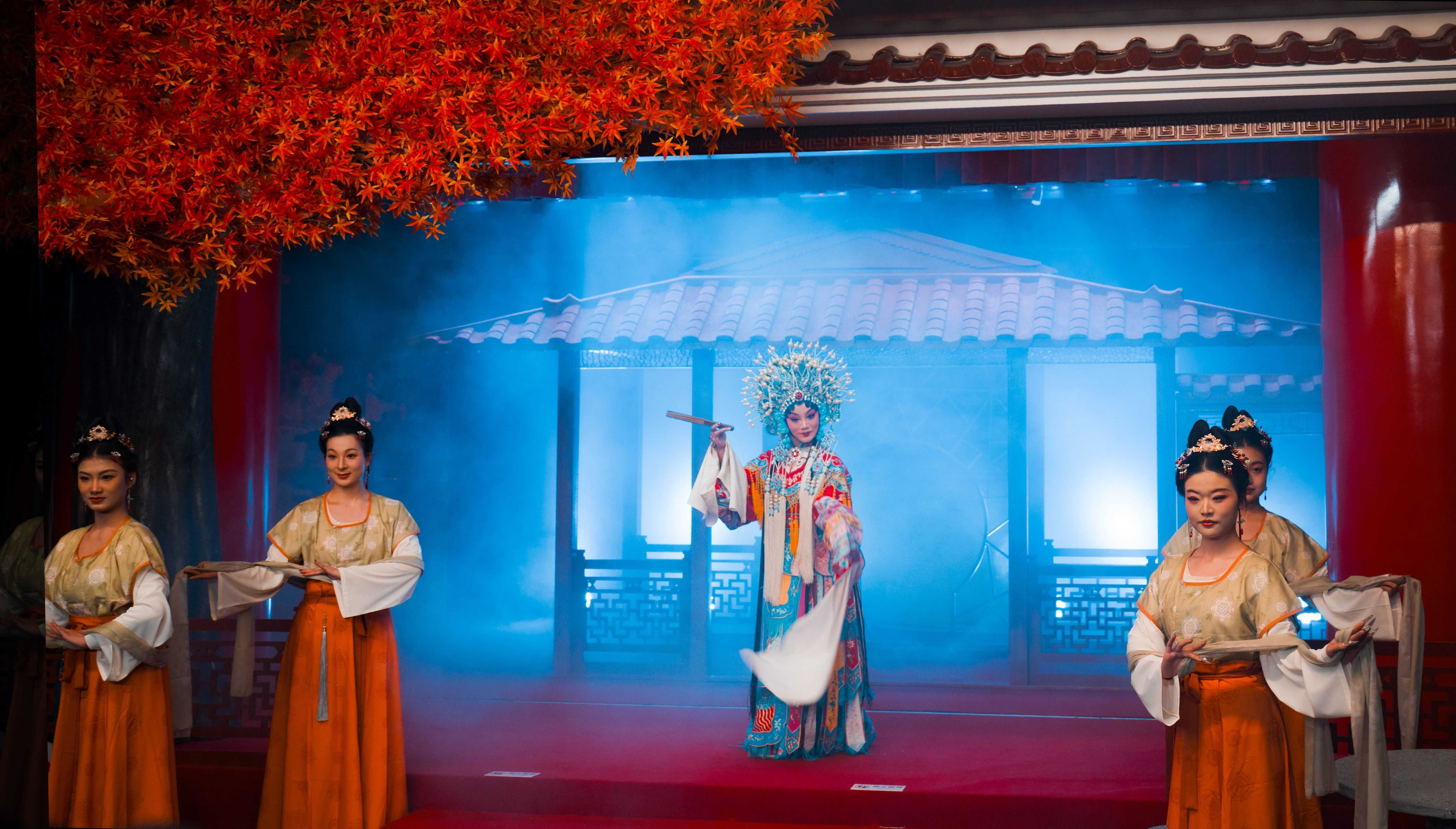 与传统观演模式不同,这场演出的参与感贯穿始终。入场前,各阵营演员会详细讲解任务规则;随后,在身着古装的“太监”躬身引导下,观众有序入场,仪式感十足。演出主场地设在二楼美成剧场,而闯关游戏则位于三楼汉剧博物馆——观众需在此完成“寻找汉剧信物”“回答汉剧知识”“学习汉剧动作”等趣味任务。每完成一项即可为所属阵营加分,还能为杨贵妃选定专属寿礼,之后前往二楼剧场为贵妃贺寿。