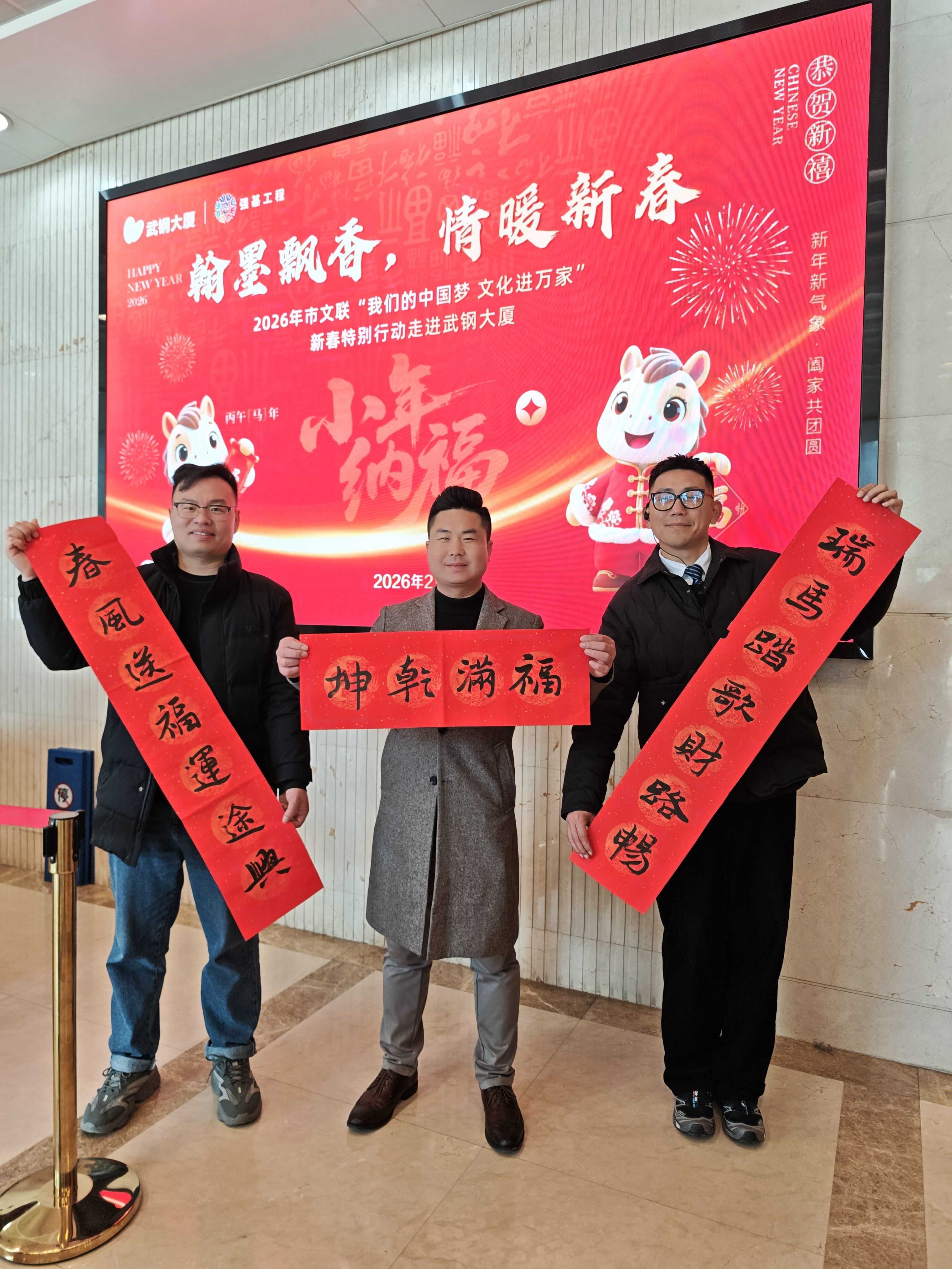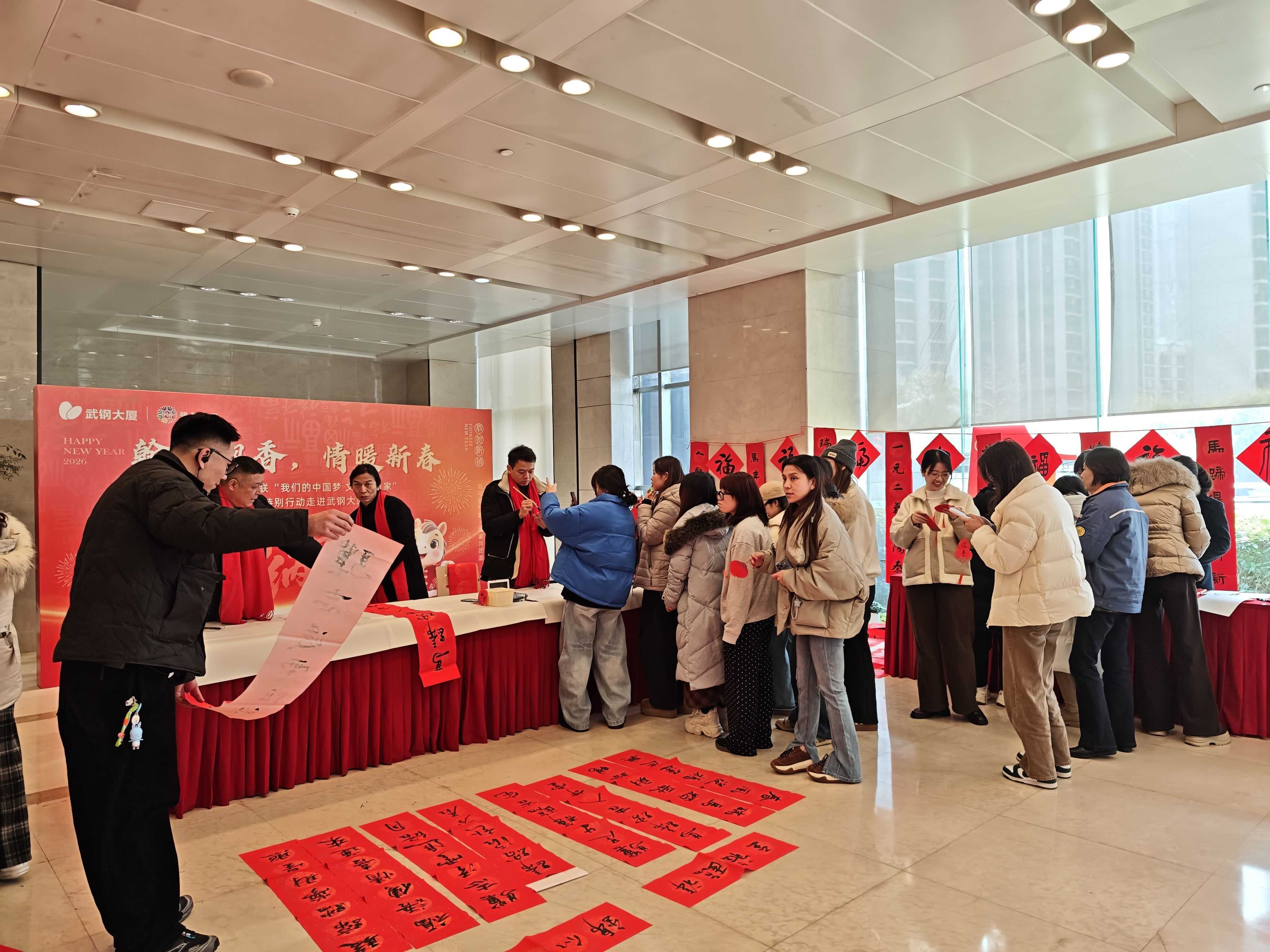 2月11日,活动热度不减,新春祝福直达企业一线。武汉市文学艺术界联合会联合武钢文联组织的文艺小分队走进武钢大厦,为武钢集团生态圈总部园事业部的职工们送去别样年味。活动现场,书法家们挥毫泼墨,一副副寓意吉祥的春联承载着对劳动者的美好祝愿。同时举办的“寻年记·集五福”活动增添了互动乐趣,让职工们在翰墨书香与欢声笑语中感受到浓浓暖意。
