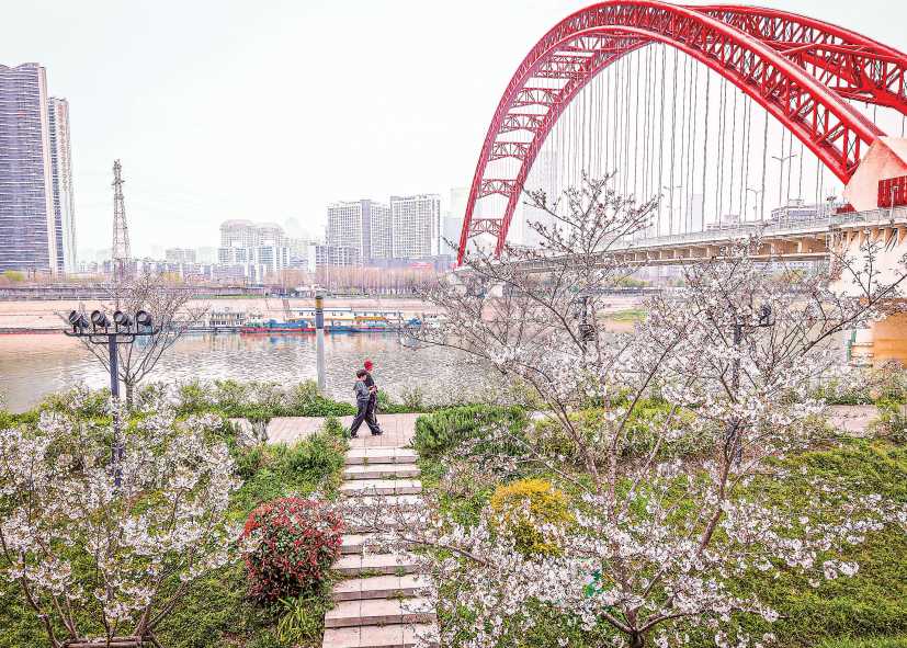 春阳正好,武汉樱花迎来盛花期。3月25日,在长江、汉江交汇处的南岸嘴公园,300余株樱花花开正艳,迎来最佳观赏期,粉白相间的樱花缀满枝头,与长江、汉江交汇的滨江风光相映成趣。