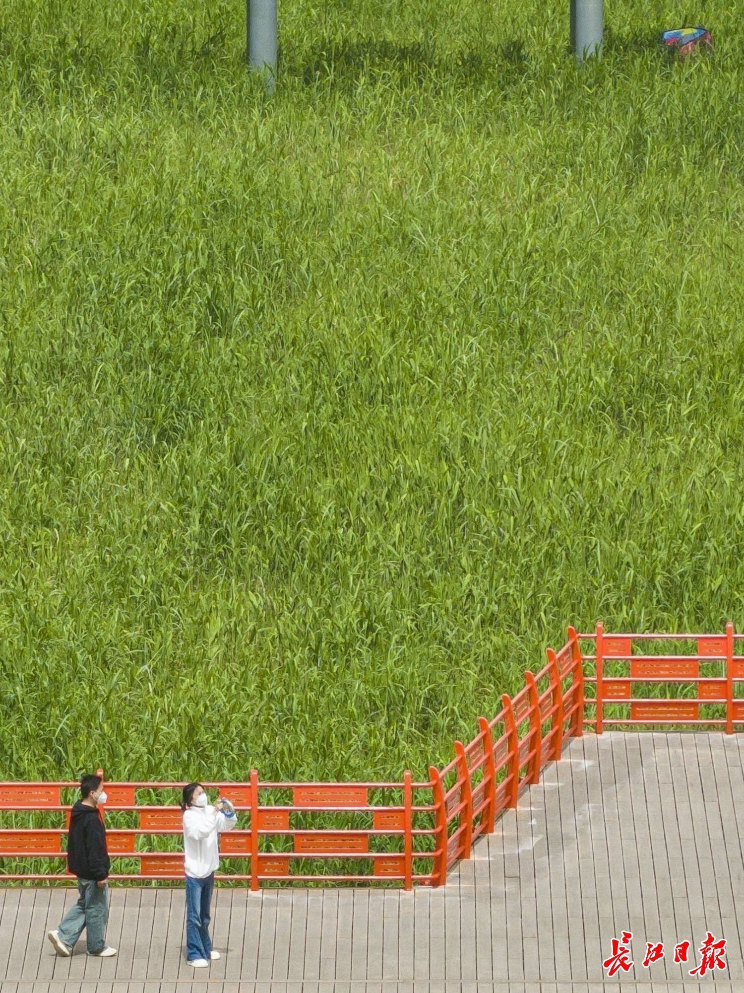 洪山江滩的白沙洲右汊,曾是砂石堆积的“灰色地带”。如今,设计者重塑野趣,一片生机盎然。市民王女士带着女儿辨认植物:“这是益母草,那是接骨木。”