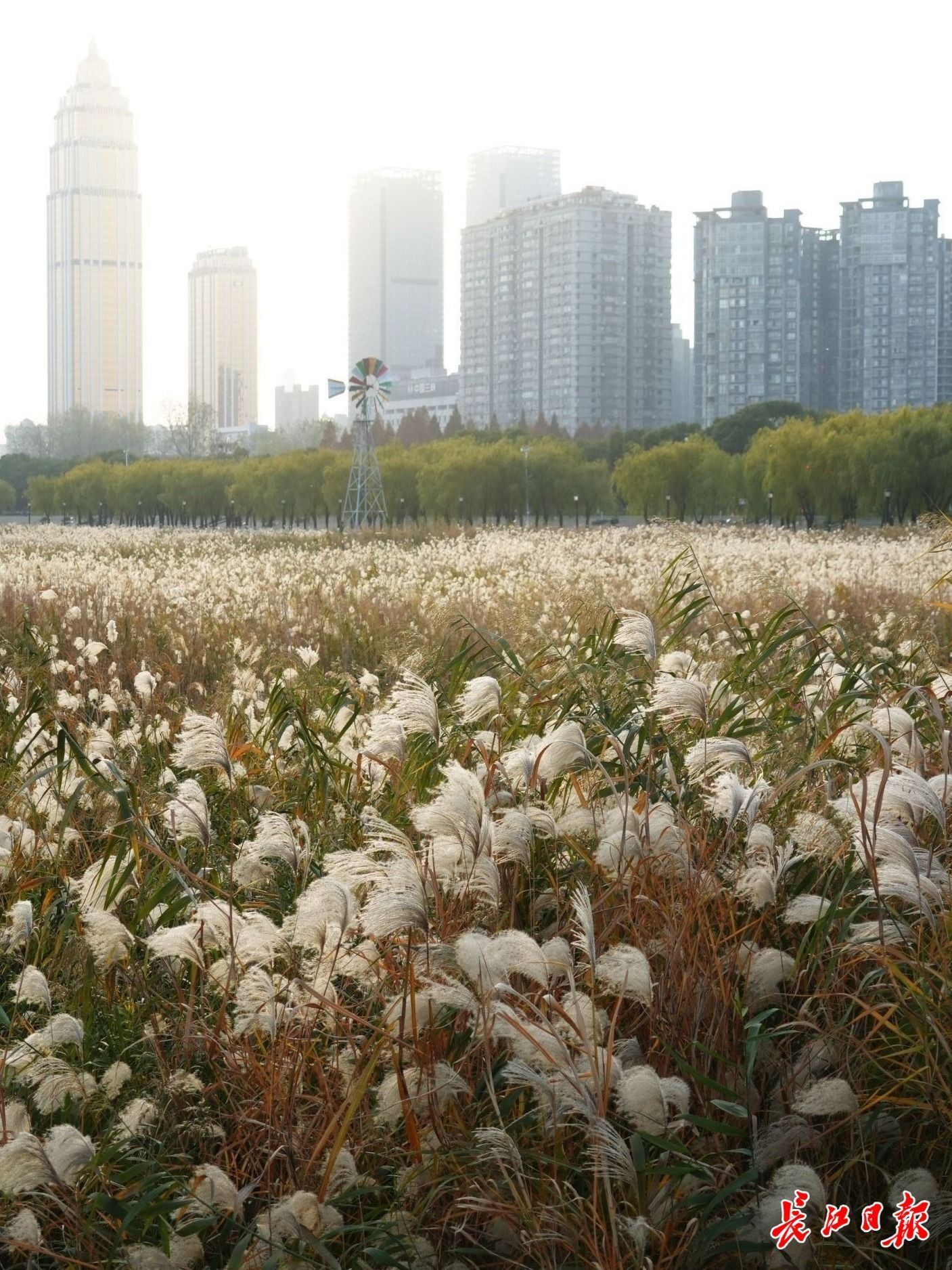 汉口江滩芦荻绽放,绵延6公里花絮如雪,吸引众多市民前来。