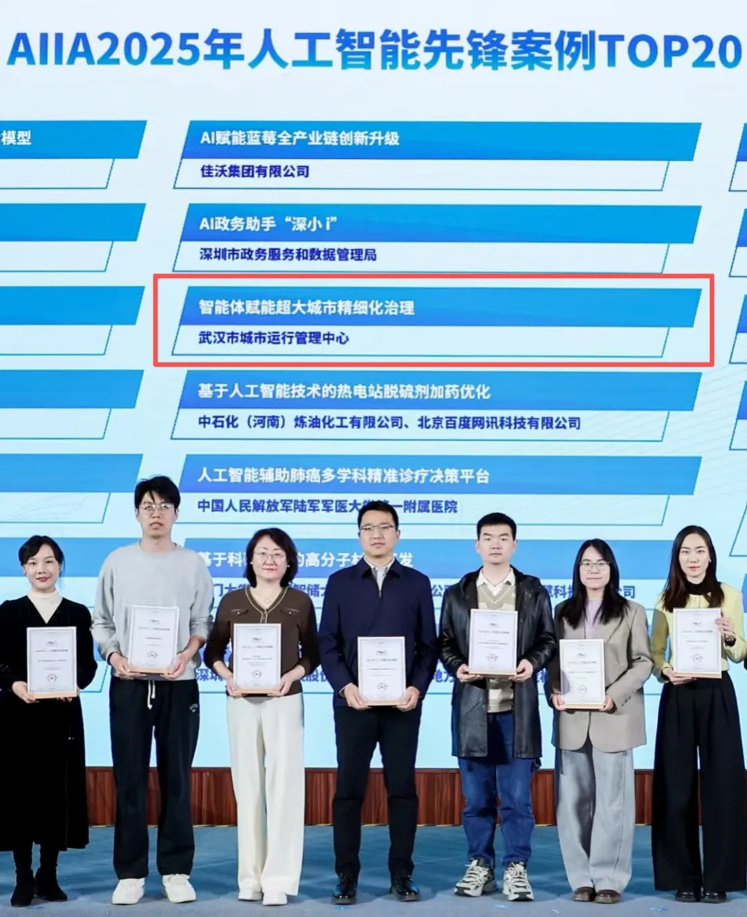 作为本次会议的重要环节,中国人工智能产业发展联盟“2025年人工智能先锋案例”评选自启动以来便获得国内外广泛关注与积极响应。此次评选共收到来自中国内地、中国香港、中亚等多个地区的申报案例507项,覆盖大模型、生成式人工智能、具身智能等前沿技术,应用于医疗、交通、政务等34个重点行业,贯穿生产、经营、管理与运营全场景,充分展现出人工智能赋能千行百业的创新活力与应用深度。经过各工作组专家及知名学者一周实地考察与多轮严格评审,武汉市城市运行管理中心《智能体赋能超大城市精细化治理》荣膺先锋案例Top20,也是全国城市治理领域唯一入选案例(政务领域仅武汉、深圳2个城市入选)。
