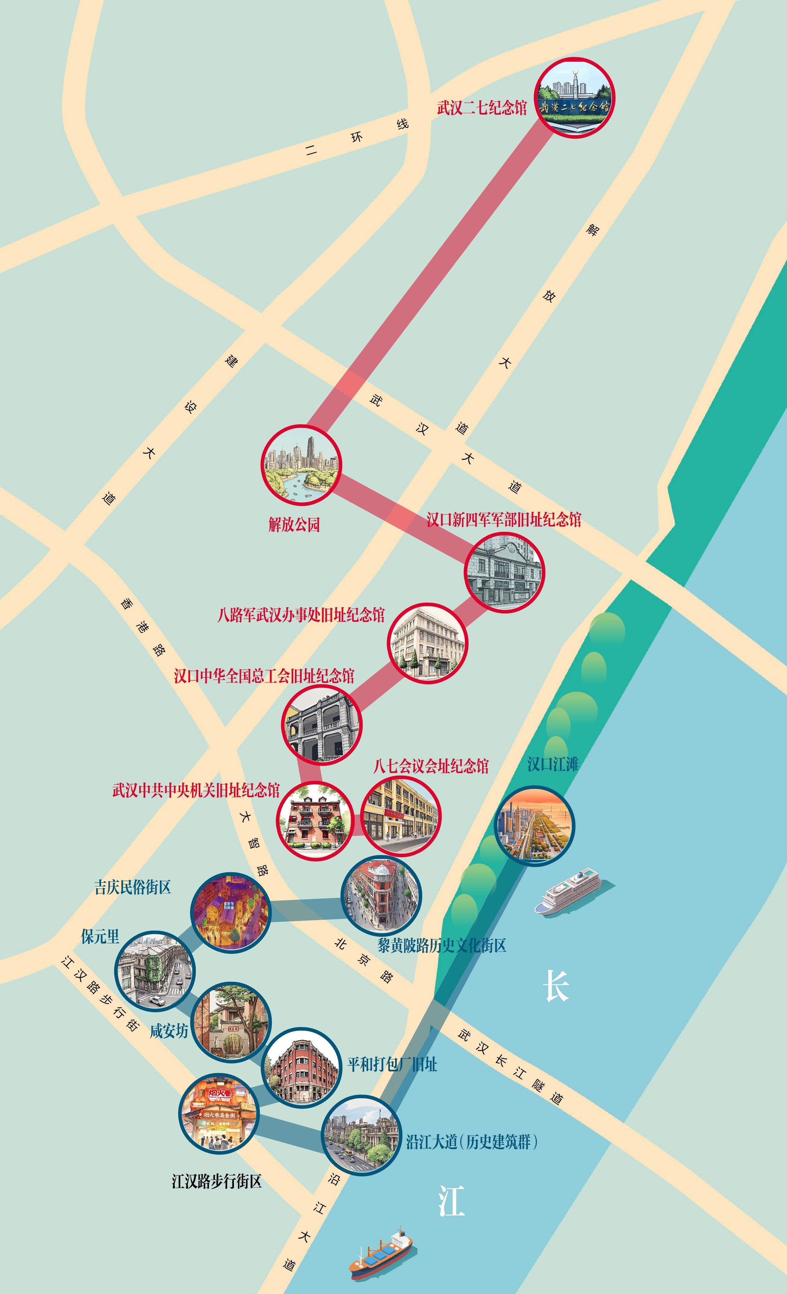 八七会议会址纪念馆—武汉中共中央机关旧址纪念馆—汉口中华全国总工会旧址纪念馆—八路军武汉办事处旧址纪念馆—汉口新四军军部旧址纪念馆—解放公园—武汉二七纪念馆