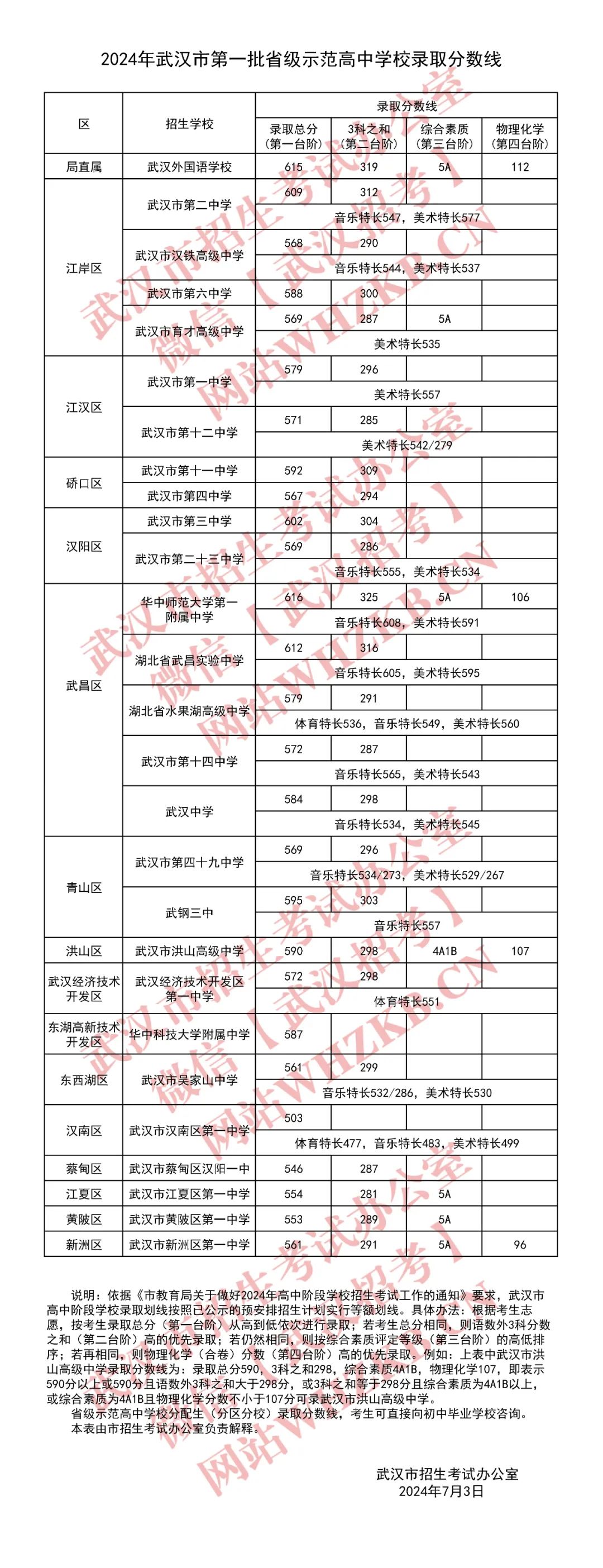 2024年武汉市第一批省示范高中录取分数线公布